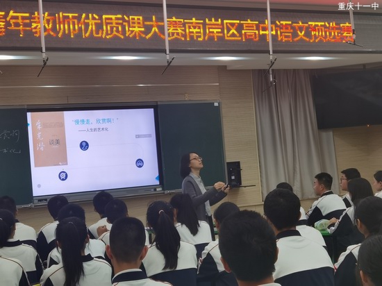 比赛现场,参赛教师就指定篇目——朱光潜先生的美学名篇《“慢慢走,欣赏啊!”——人生的艺术化》同课异构,七位优秀老师的课堂亮点纷呈。