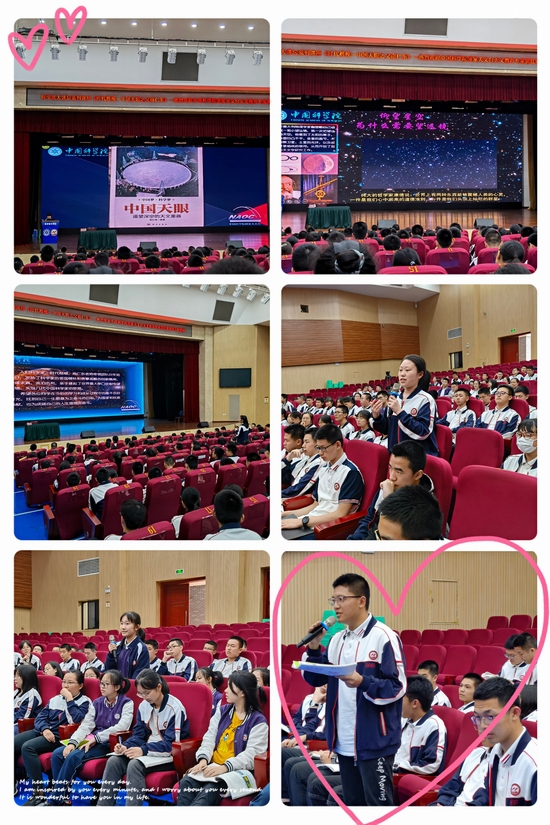 郭老师说是爱国的热情支撑着他坚持下来,勇于为祖同的科学创新担当重任,一直奋斗到生命的最后时刻。同学们在郭老师娓娓道来的讲解中,看到了一位英雄在不断探导着生命的真谛,他身上闪耀的人性的光辉照亮了孩子们前行的科研之路。郭老师带领同学们探知天眼奥秘,激发同学们了解未知的渴望!