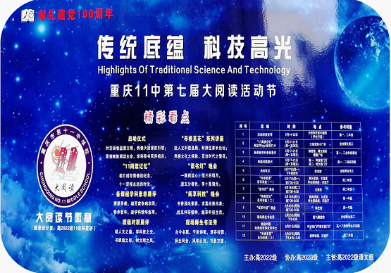 2021 年 5 月 14 日至 22 日,重庆市第十一中学校开展“传统底蕴 科技高光”系列活动,即重庆11中第七届大阅读活动节。“备课组学科素养展评”、“班级对联展评”、“寻根觅华系列讲座”、“读书灯晚会”、“阅享科技晚会”、“现场师生书法秀”等为精彩看点。