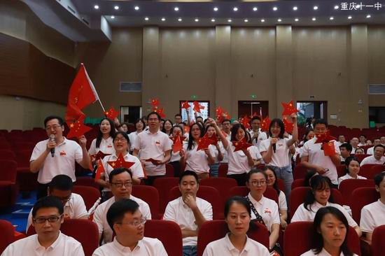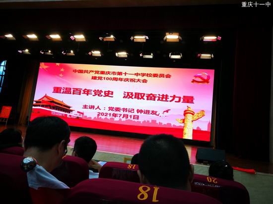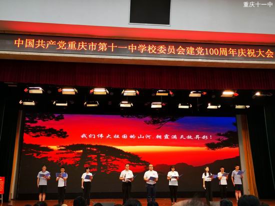 71日下午,中共重庆市第十一中学校委员会在文益堂召开了以“传承红色基因,献礼建党百年”为主题的建党100周年庆祝大会。高中第三党支部党员和学生情景诗朗诵《党旗颂》和 快闪《同心向党》两个节目,表演充满激情与力量,共同传递红色精神接力棒。