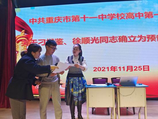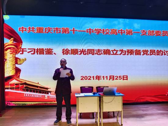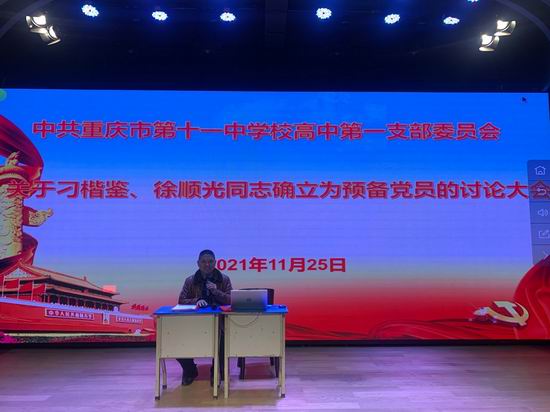 2021年11月25日下午4点,高中第一党支部全体党员在识益演播厅开展了“关于刁楷鉴、徐顺光同志确立为预备党员”的讨论大会。本次会议全体党员,听取刁楷鉴、徐顺光同志汇报,展开充分讨论。同意刁楷鉴、徐顺光同志成为中国共产党预备党员。