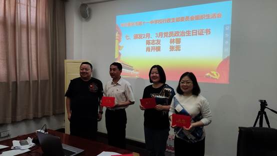 行政党支部为2、3月过政治生日的党员同志主持了政治生日仪式,谭远松同志为陈志友、林馨、张蕊、肖开模四位党员颁发了政治生日贺卡。
