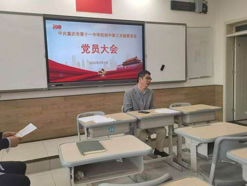 习近平总书记在2022年春季学期中央党校(国家行政学院)中青年干部培训班开班式上的重要讲话,从党和人民事业后继有人的战略高度,对年轻干部提出重要要求,饱含着对年轻干部的殷切期望,为广大年轻干部健康成长指明了努力方向,要深入学习领会、坚决贯彻落实。2022年3月4日上午,初中第三党支部召开党员大会,支部书记赖德东同志主持会议,他要求支部全体党员要认真学习讲话精神。