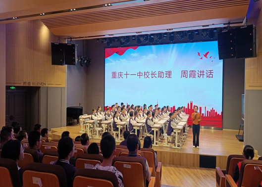 重庆十一中校长助理周霞出席学习活动并致辞。周霞助理先告诉全体同学为什么学校史、怎样学校史、怎样学好校史。让同学们知道不仅需要了解学校历史,同时也要学习十一中校友们的精神品质。然后引导同学们认识到这次活动的意义。呼吁同学们以实际行动向十一中的110周年校庆献礼,并预祝活动圆满成功。