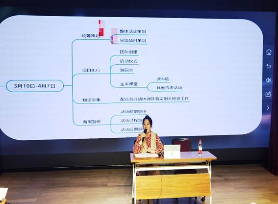 高2023级主创团队代表隋文娟老师做本届大阅读活动项目详细讲解,对每一个活动的环节设想、开展计划、人员调动等进行布置安排,并对重点项目,如十一中校史剧、《平凡的世界》编演等,指方向,做强调,明意义。