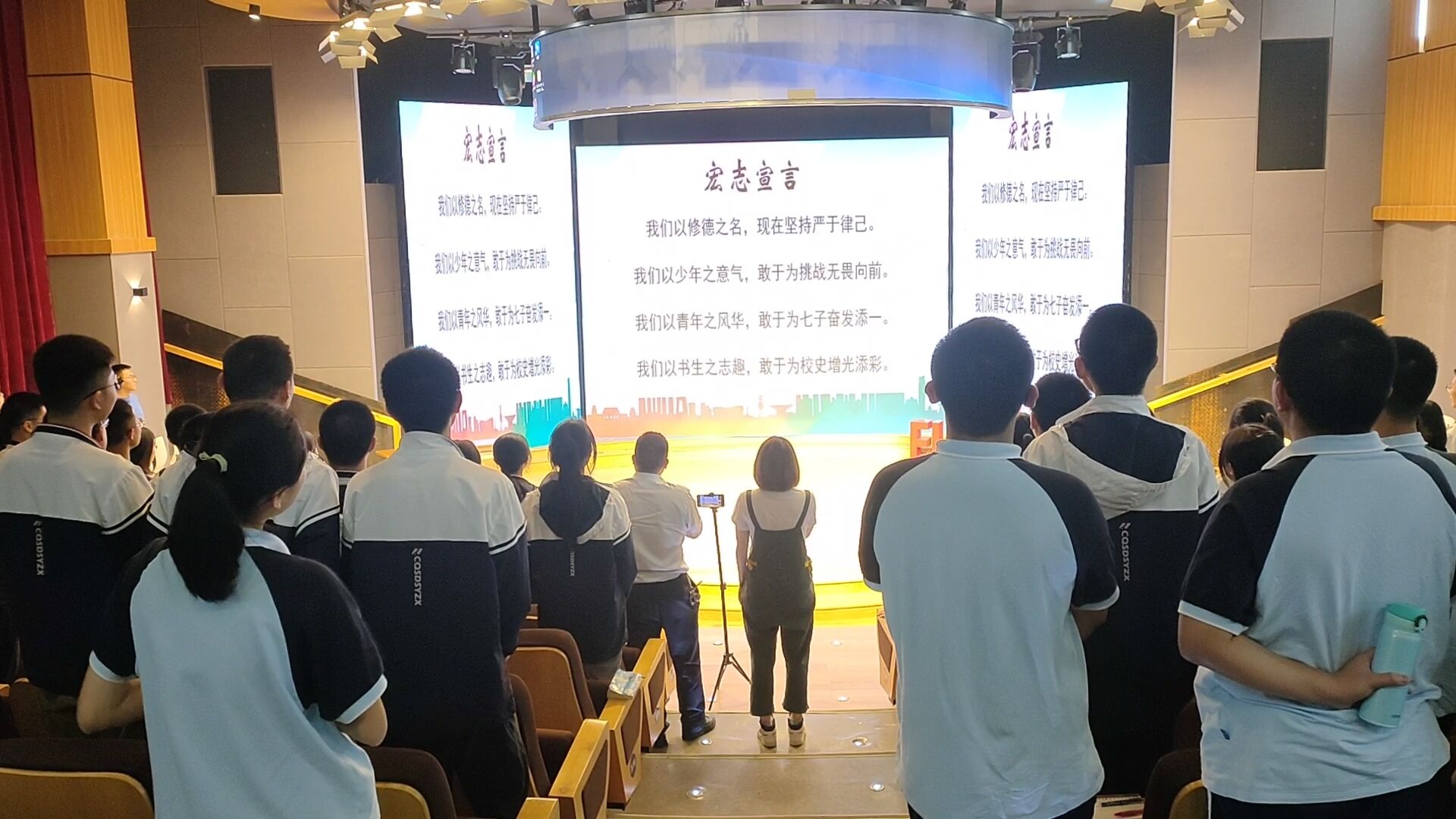 证书颁发结束后,荧幕上的播放着全体同学亲手写下的梦想,紧接着3班、4班班主任谭迎春老师和余飞扬老师带领着两个班级进行了梦想宣誓。一声声誓言,喊出的是他们对远方矢志不渝的追求与热爱,是奋不顾身背负行囊去寻光的拼劲。