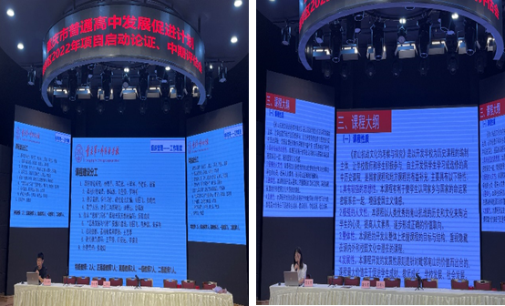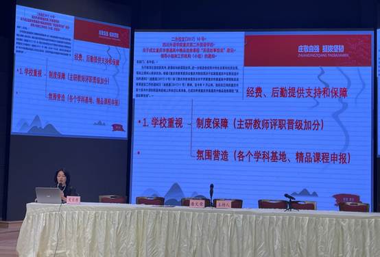 重庆第二外国语学校今年成功申报2个精品选修课程,王翠荣老师主持的“思维发展与写作”精品选修课程,从组织管理、工作推进、队伍建设、课程建设、学生发展、成果推广等方面进行了汇报,着力培养学生思维的方式,写作的逻辑,促进学生形象、逻辑和创新思维与写作素养的提升。苟学珍老师主持的“南山抗战文化的考察与探究”精品选修课程,从课程申报、课程方案、课程大纲、建设规划、效果检验等方面进行汇报。以“小地方大历史”为研究路径,以南山抗战遗址博物馆为视点,挖掘南山历史背后的文化资源,阐明中华民族精神的渊源与特质,从而重新建构和解释的历史文化,培养学生的家国情怀,提升历史学科核心素养的发展。