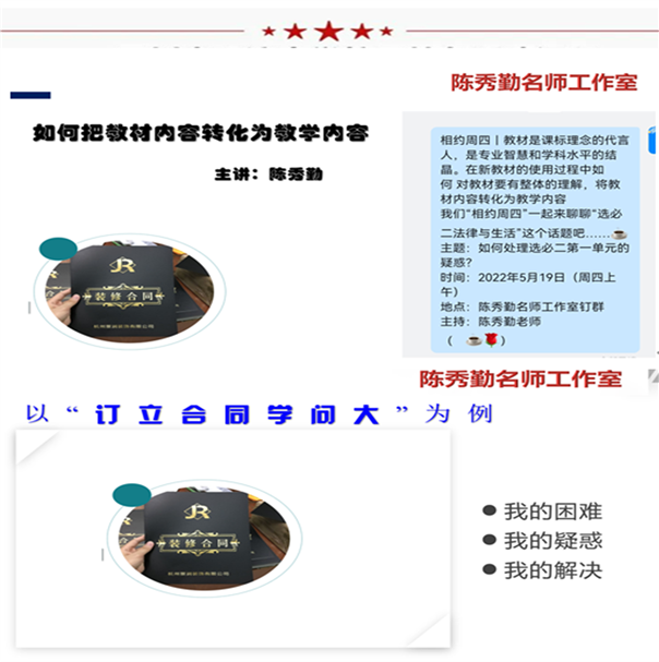 2022年5月19日上午,陈秀勤名师工作室全体成员线上观看直播的方式参与此次活动。本次活动由主持人陈秀勤老师做了关于“教材内容转化为教学内容”的分享。