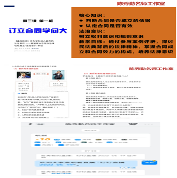 主持人:我的解决措施是挖掘隐形课程资源对接教材核心知识培养法治意识。那么如何对接,如何理解法治意识呢?