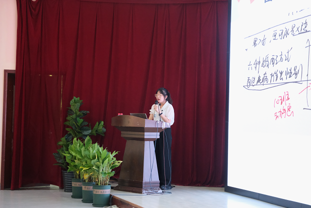 结业仪式的第一项内容,由新教师代表邹蝶老师为大家分享“追光不止,向阳而生”的教师成长感悟。邹蝶老师首先讲述了自实习以来与重庆十一中的缘分,从“事前定则不困—教学准备”、“行用心则不废—教学管理”、“心向阳则无悔—教学心态”三个部分展开分享。她从自己备完课--会备课--备好课的转变,提醒同仁们学会站在巨人肩膀上成长,与备课组的老师们吃透教材,同时学会做一名“阳光”教师,去做学生们的太阳,指引他们;也做自己的太阳,赋能自己。