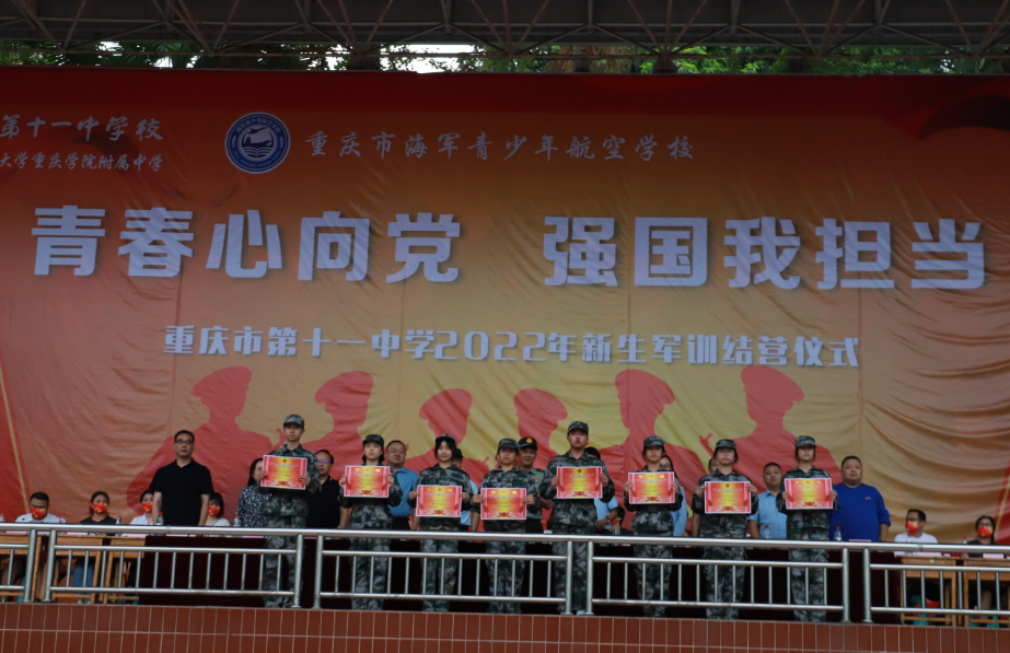 家校共育同表彰,奋发激昂启新章许刚强副校长宣读表彰决定,表示同学们发扬了军人的优良品质和作风,展示了重庆市第十一中学校良好的精神风貌。其中共评出了8个优秀连队和138名军训优秀学员,并希望其他同学能向先进学习。语毕,台下掌声雷动,随后颁奖仪式庄重有序地进行。