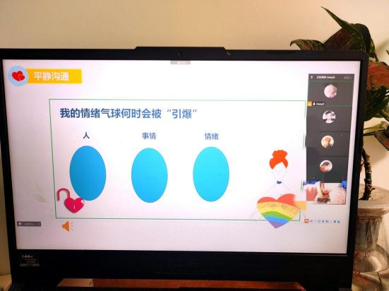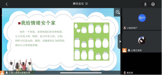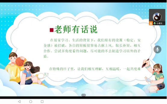 在疫情居家学习、生活期间,家庭成员间免不了会增加更多的接触,王婷婷老师给同学们带来了关于疫情下自我关怀的主题讲座。她提到,了解家庭成员的特点是帮助学生们理解自己及家人的有利工具,规避性格短板,发扬长处,不让沟通成为居家学习的阻碍。最后王老师又带领学生绘制自己的“情绪容器”,以便于学生们更直观地了解自己的情绪状态,觉察并有意识地做出情绪补充。心安定方才是我们居家学习生活的有利保障。
