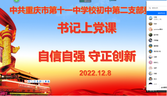 12月8日下午五点,初中第二党支部通过腾讯会议的方式组织全体党员举行十二月主题党日活动,会议由支部书记刘宇主持,初中第二党支部的党员同志参加了此次会议。
