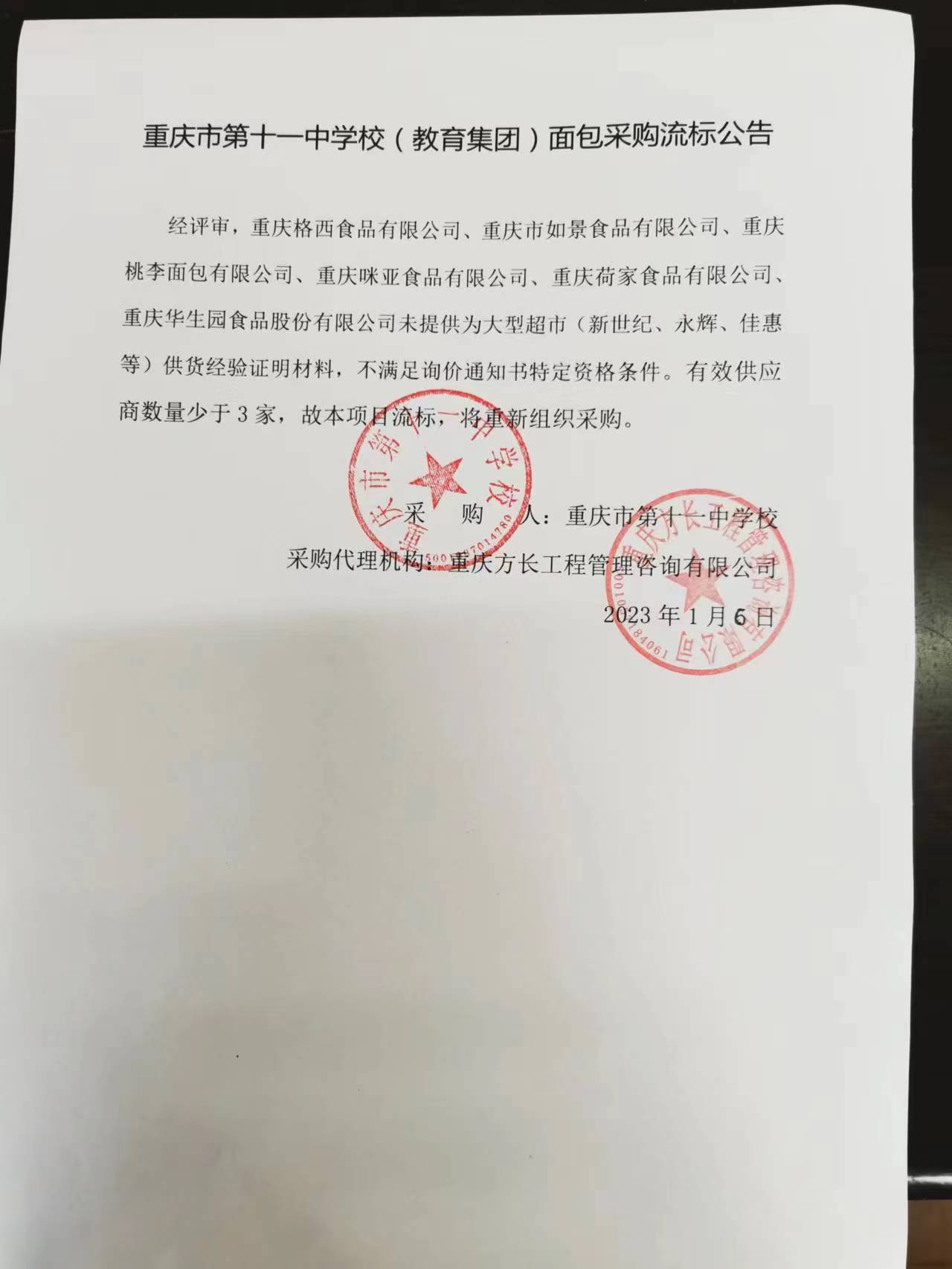 重庆市第十一中学校(教育集团)面包采购流标公示