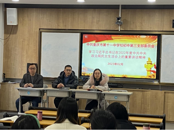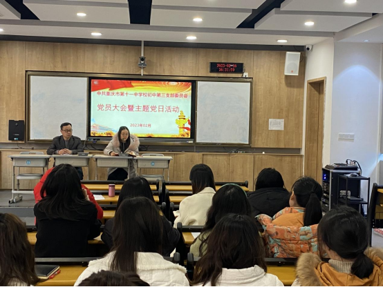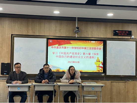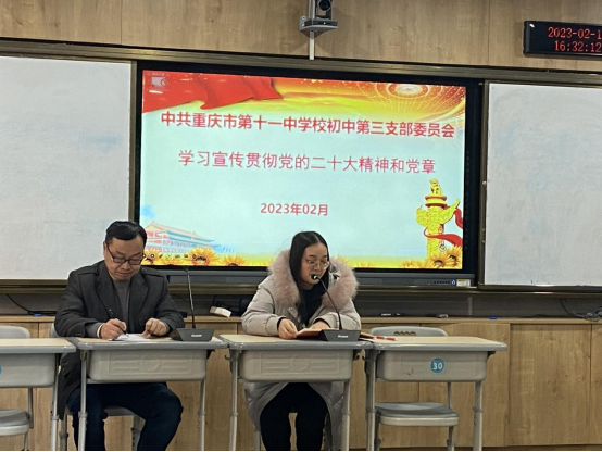 2023年2月16日下午,初中第三党支部在文德中学江南新城校区开展主题党日活动。本次活动的主题为:深入学习宣传贯彻党的二十大精神、党章、党史。支部分别学习了习近平总书记在2022年度中共中央政治局民主生活会上的重要讲话精神,学习习近平总书记对重庆工作作出的营造良好政治生态,坚持“两点”定位,实现“两地”“两高”目标,发挥“三个作用”,推动成渝地区双城经济圈建设,加快建设西部陆海新通道等系列重要指示批示精神;学习市委六届二次全会精神。学习了党的二十大修订后的党章第四章《党的地方组织》;学习了《中国共产党简史》第六章《探索中国自己的建设社会主义的道路》等内容。