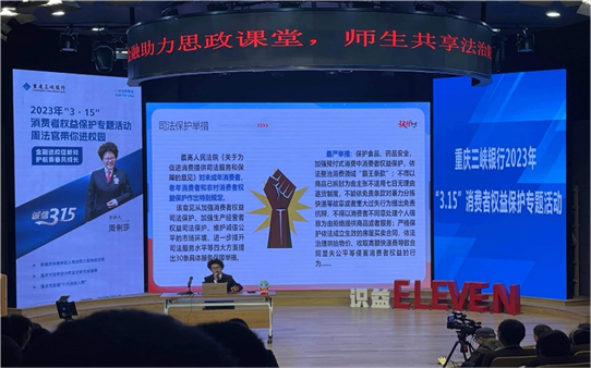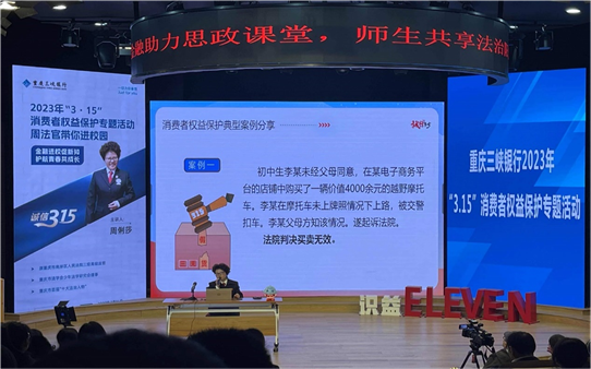习近平总书记指出:“思政课不仅应该在课堂上讲,也应该在社会生活中来讲”,“‘大思政课’我们要善用之,一定要跟现实结合起来”。2023年3月16日,在重庆市第十一中学校110周年校庆来临之际,我校政治名师工作室联合重庆三峡银行、南岸区周俐莎法治工作室举办了以“金融助力思政课堂,师生共享法治荣光”为主题的“3.15” 消费者权益保护宣教活动,共筑“大思政课”法治长城。