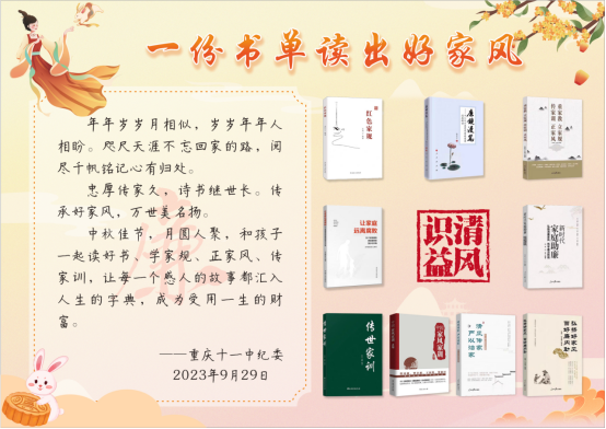 重庆十一中立足于学校文化特色和精神特质,推动清廉学校建设,把2023年9月作为廉政主题教育月,通过开展“培根铸魂”行动,打造“清风识益”廉政品牌,推动学生“五个一”清廉行动,即组织一次廉政教育国旗下主题演讲、召开一次敬廉崇廉主题班会、完成一期廉政教育主题黑板报、开展一次廉政文化作品展和组织一次品读清廉家书活动。9月27日,校纪委开始推出中秋节前家校共育清廉书单:《红色家规》《廉镜漫笔》《重家教 立家规 传家训 正家风 》《让家庭远离腐败》《新时代家庭助廉》《传世家训》《中国家风家训》《清风传家 严以治家》《弘扬好家风 当好廉内助》等,用一份好书单读出廉家风。“年年岁岁月相似,岁岁年年人相盼。咫尺天涯不忘回家的路,阅尽千帆铭记心有归处。忠厚传家久,诗书继世长。传承好家风,万世美名扬。中秋佳节,月圆人聚,和孩子一起读好书、学家规、正家风、传家训,让每一个感人的故事都汇入人生的字典,成为受用一生的财富。”