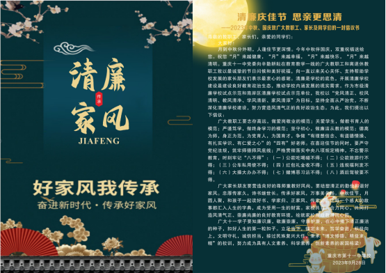 习近平总书记指出,不论时代发生多大变化,不论生活格局发生多大变化,我们都要重视家庭建设,注重家庭、注重家教、注重家风。2023年中秋国庆“双节”将至,为深入贯彻落实中央八项规定精神,进一步强化学校党员、干部廉洁自律意识,引导全校教职工文明廉洁过节,驰而不息纠治“四风”,持之以恒正风肃纪,筑牢拒腐防变思想防线,营造和谐的家校共育良好氛围,9月27—28日,重庆十一中推出中秋、国庆节前系列主题活动,开展“守规矩,讲纪律,树家风,做榜样”家校活动,确保将廉洁教育传递给每一名党员干部、教职工以及每一位家长和学生,形成全校内外崇廉尚洁的良好氛围。