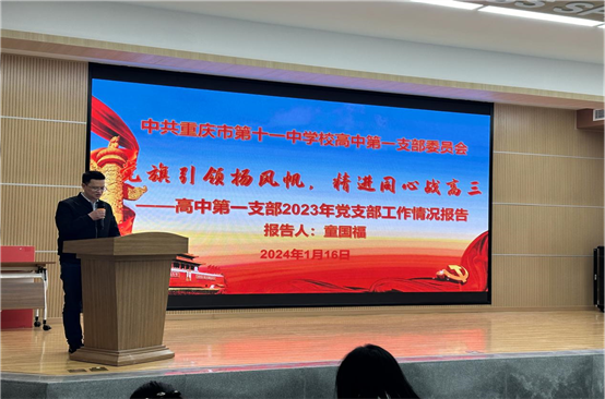 会议伊始,支部书记童国福作了题为《党旗引领扬风帆,精进同心战高三》的支部2023年度党支部工作情况的报告,童书记讲到2023年支部以党建为引领,以思想为抓手,以问题为线索,以自主自律建设学风,以守正创新维护教风,真抓实干,有效推动支部年级工作的发展;并从四个方面详细回顾了2023年支部的工作情况:一是胸怀“国之大者”,让党性在思想深处扎根;二是笃行“自主自律”,让学风在学业深处涤荡;三是坚持“守正创新”,让教风在实践深处回响;四是深入“查摆问题”,展望未来铸魂增效。