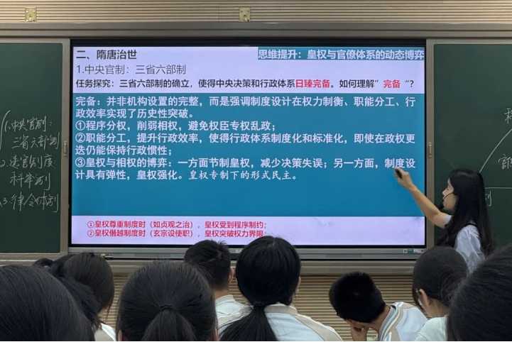 历史组聚焦“隋唐制度变革”。南开中学赵芷琦老师通过史料分析构建知识体系;我校张丽丽老师以“统一多民族国家建构”为大概念,深化历史解释能力。南开中学赵靖老师的“三轮复习法”讲座为高三备考注入新思路。
