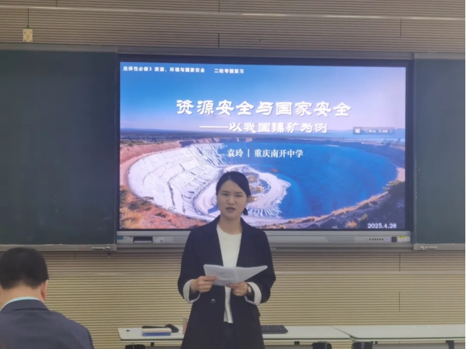 地理组围绕“资源安全”。我校张怡老师运用数据可视化构建评估模型;南开中学袁玲老师以高考真题为切口,示范深度解题策略。课后,教研员董永盛结合二诊数据提出“微专题+大单元”融合复习建议,助力备考提质增效。