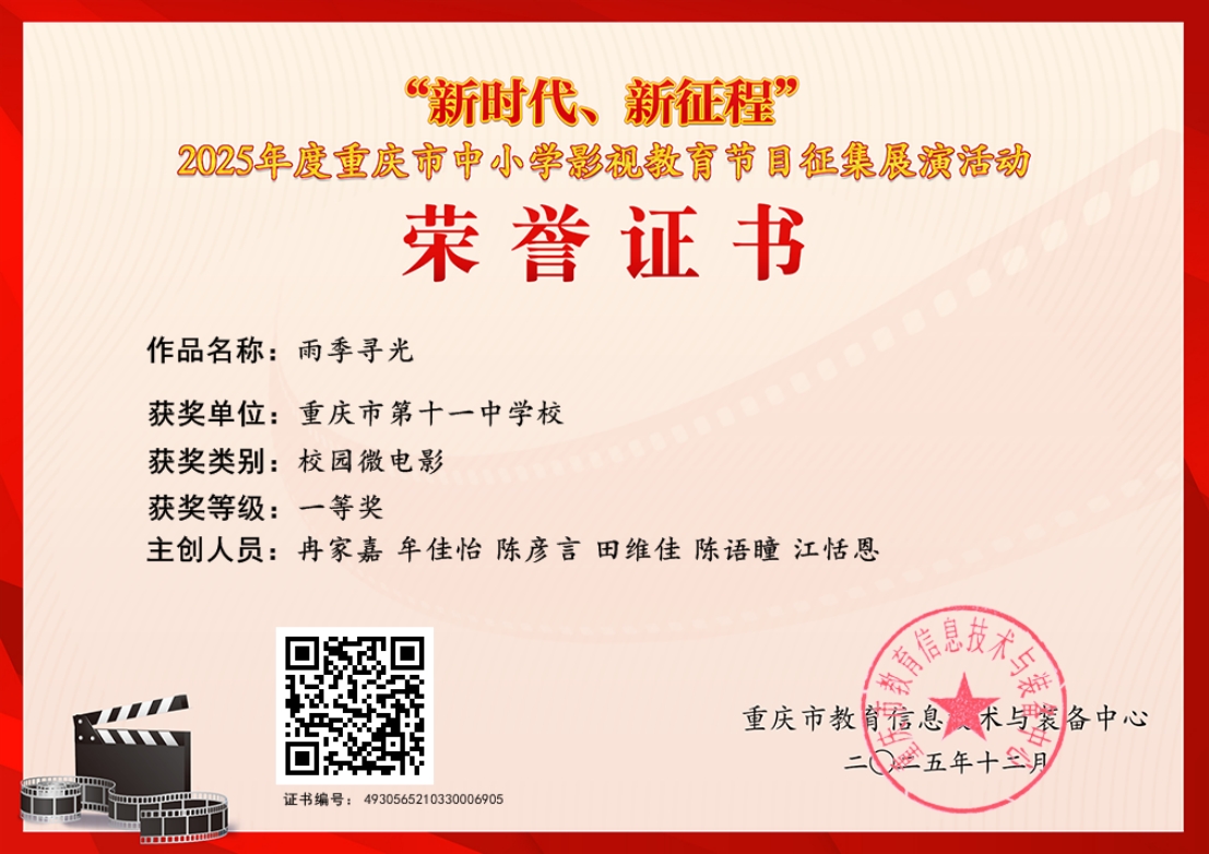 近日,2025年度重庆市中小学影视教育节目征集展演活动评选结果揭晓,我校青鸟微影社学生团队创作的微电影《雨季寻光》荣获一等奖。该作品凭借细腻的情感表达、鲜明的青春主题与出色的视听语言,在全市众多参赛作品中脱颖而出,成为学校影视育人实践的又一亮眼成果。